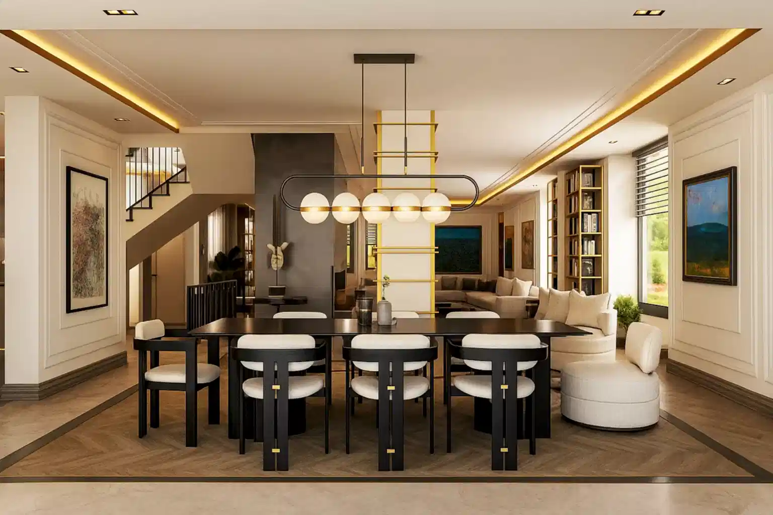 “Ankara villa iç mimarlık projesinden bir yemek alanı detayı: modern iç mekan tasarımı, fonksiyonel masa yerleşimi, doğal ışık kullanımı ve tasarım aydınlatmalar ile estetik ve konfor bir arada.”