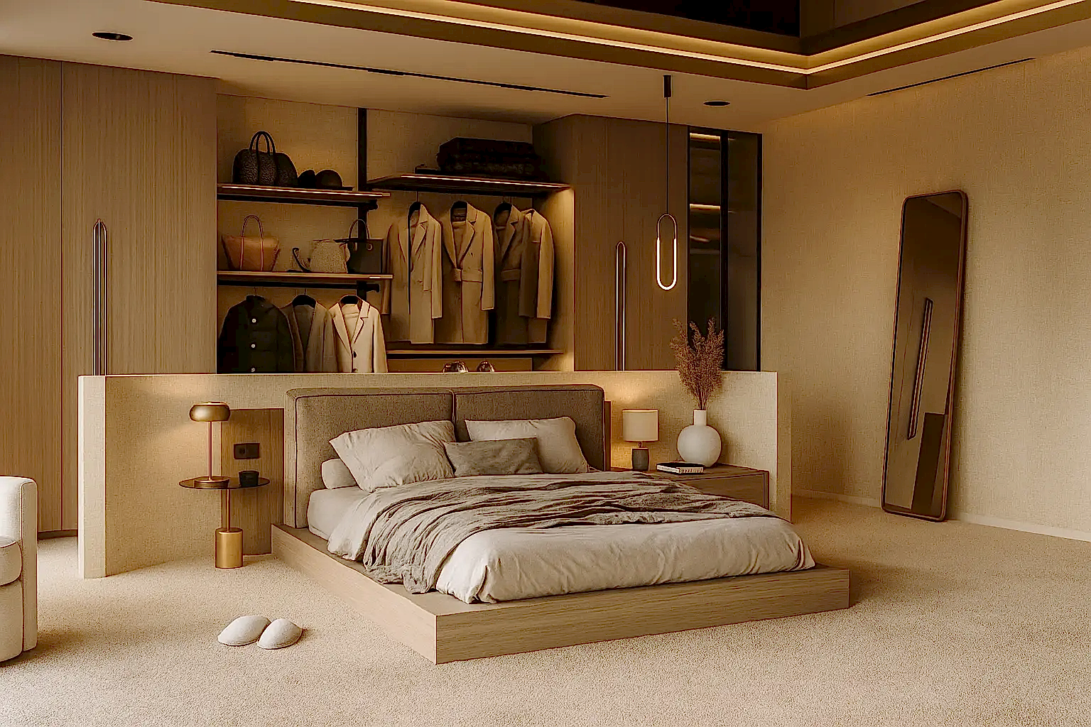 Projelerde sıklıkla kullandığımız gömme dolap sistemleri, entegre makyaj üniteleri ve modern aydınlatma detayları ile hem fonksiyonel hem estetik bir alan sunuyoruz. Yatak başlığı duvarında kullanılan doku ve malzeme kombinasyonları, odanın atmosferini kişiselleştirirken görsel bütünlüğü korur. Ankara villa iç mimarlık hizmetlerinde bu yaklaşım, yaşam alanlarının her köşesine zarif bir konfor taşır.